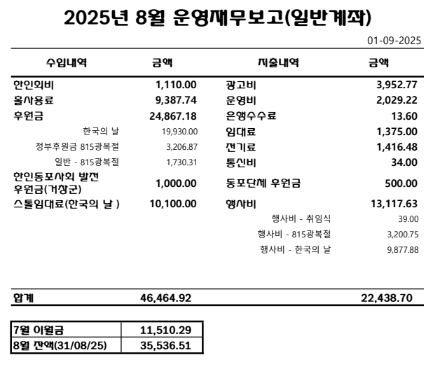 2025년 8월 한인회 운영재무보고